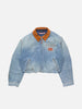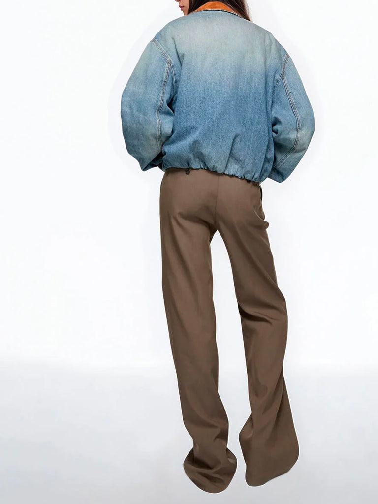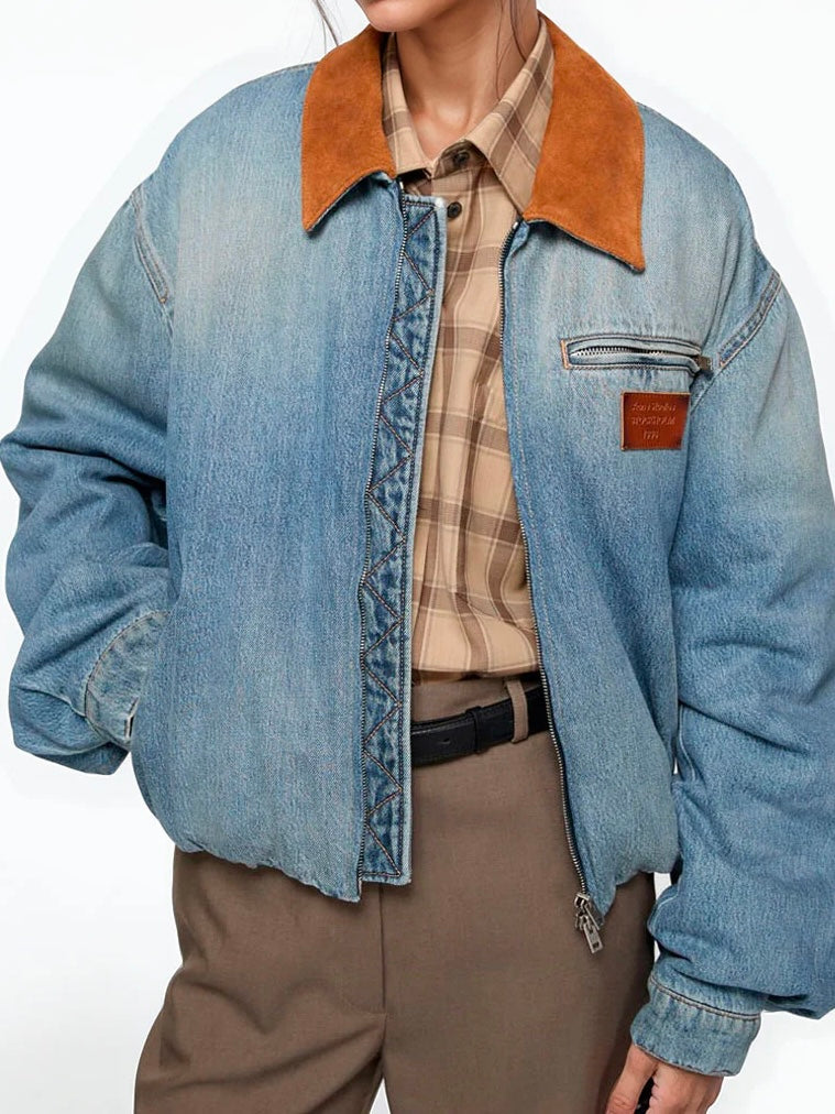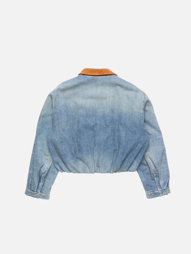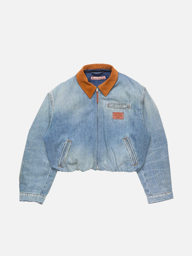 • Denim bomber jacket crafted from organic cotton denim with fading and subtle whiskers