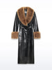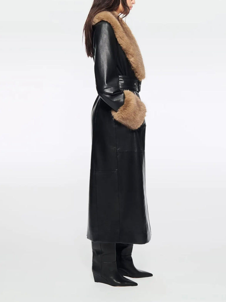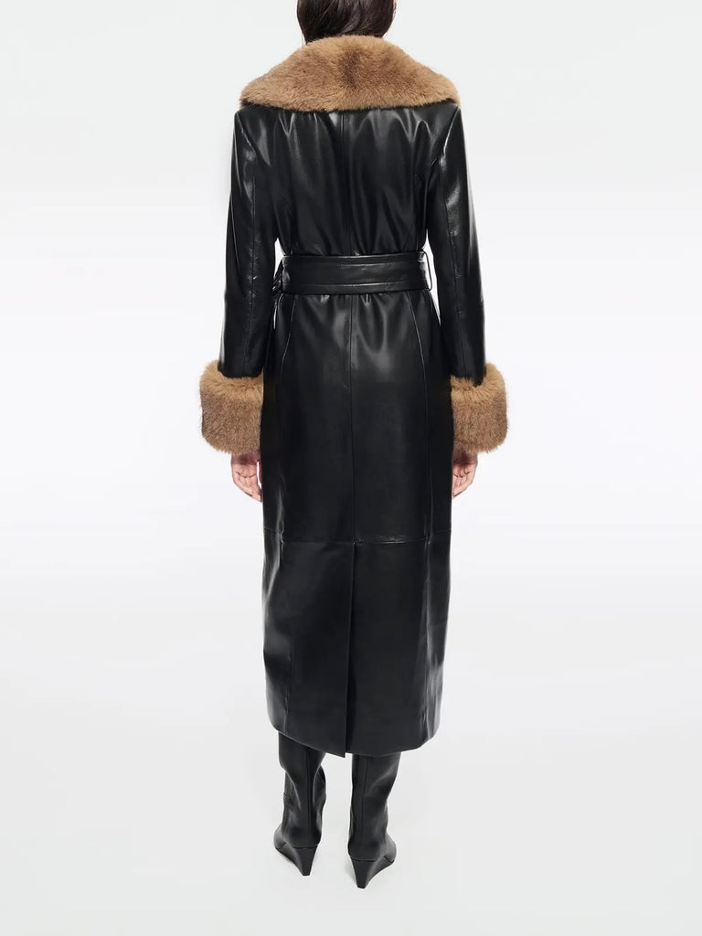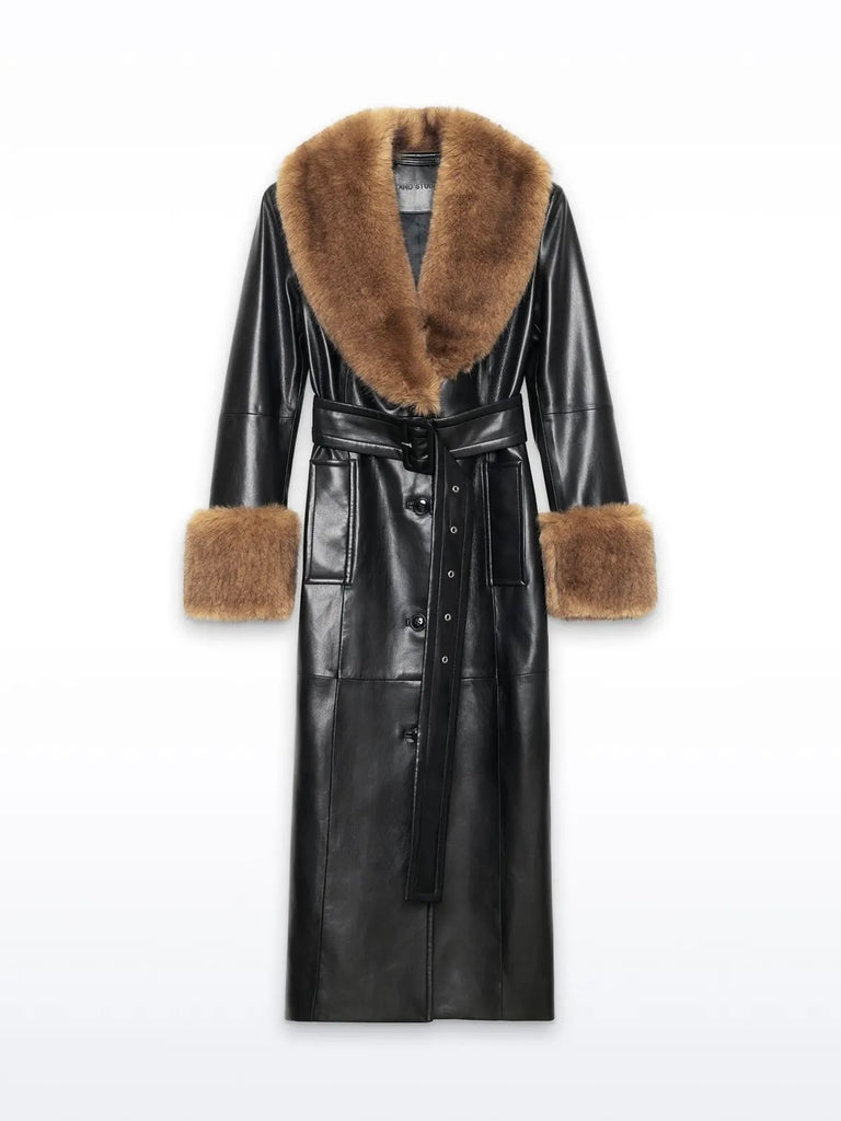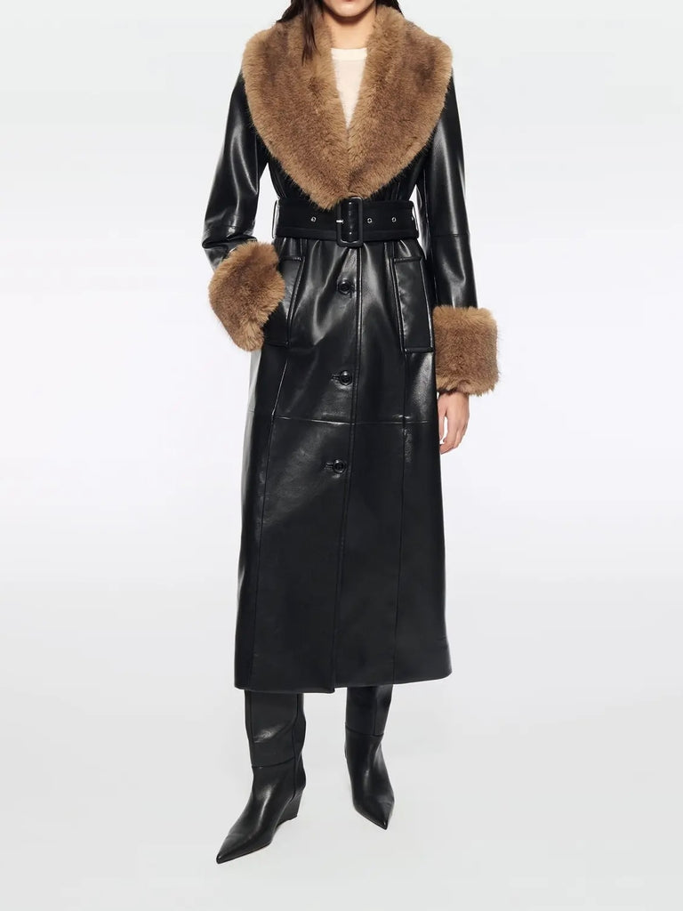 - Tam ir mākslīgās kažokādas šalles apkakle un aproces, toņos pieskaņotas pogas, pieskaņota josta un kabatas ar ielocēm.